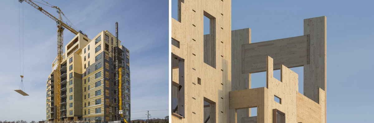 Les panneaux impliquent une transmission directe des charges de l’axe horizontal à l’axe vertical, sans aucune forme de transfert. En conséquence, l’axe vertical génère un refend continu qui discipline la planification, mais l’habitation s’en accommode très bien en raison du grand nombre de cloisons requises. Le projet Origine à Québec illustre, sur une hauteur de 12 étages, le potentiel des panneaux en CLT produits par Nordic Structures, tout en incorporant occasionnellement des poutres afin de libérer de plus grands espaces.
