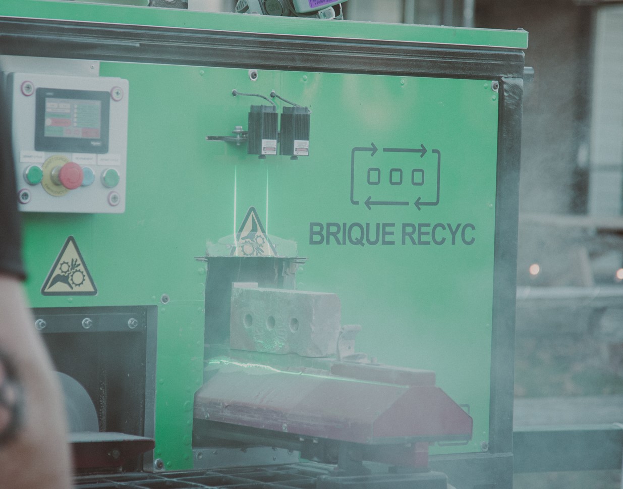 Pour mener à bien son idée, Tommy Bouillon s’est entouré de David Dufour et Hugo Cartier, tous deux associés de Maçonnerie Gratton, et a bénéficié du soutien de partenaires comme PME MTL et RECYC-QUÉBEC. En 2021, après trois ans de développement technologique, Brique Recyc recyclait officiellement ses premières briques. Celles-ci sont déposées sur un support, et un guidage laser permet d’ajuster des lames au diamant à leur format. Les lames ainsi que deux meules enlèvent l’excédent de mortier sans percussion pour ne pas fragiliser les briques. La machine recycle 500 briques à l’heure. « On récupère 100 % des briques, on descend à 440 heures de travail pour un mur de 1 000 pi2 et on évite 5,9 tonnes de CO2, annonce Tommy Bouillon. Les avantages sont économiques et écologiques. »