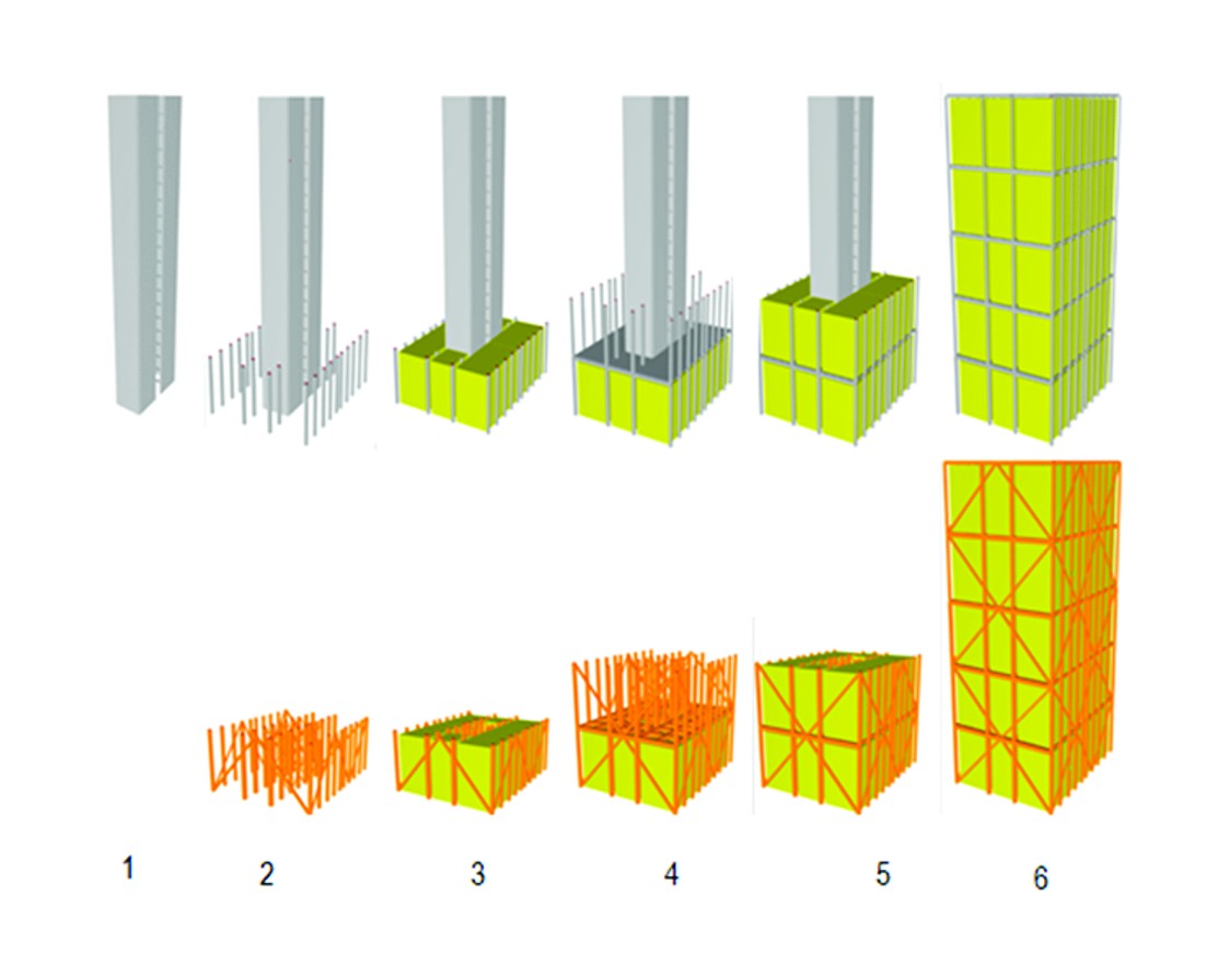 Les étapes de construction du système étudié, en béton en haut et lamellé-collé en bas. En jaune, l’introduction du système de sous-structure.