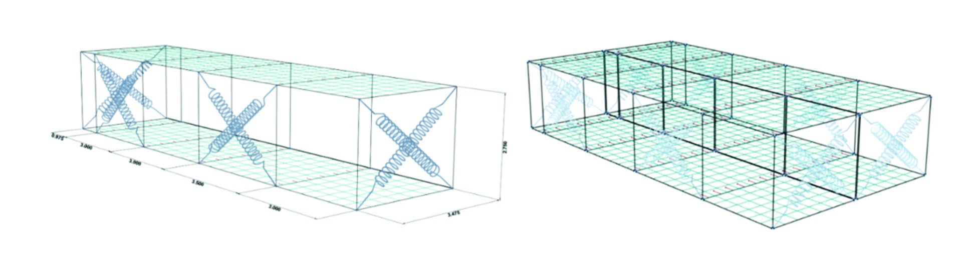 Modélisation 3D des sous-structures en ossature légère en bois. Les diagonales représentent les murs de refend en ossature légère des modules préfabriqués.