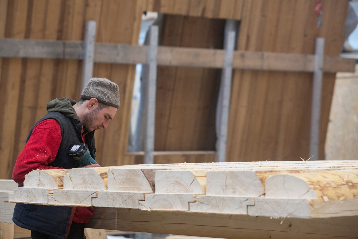 Découpe des grumes d’épicéa et préfabrication des modules du bâtiment UP STRAW dans l’usine du constructeur Mobic. – Photo : Denis Vasilov.