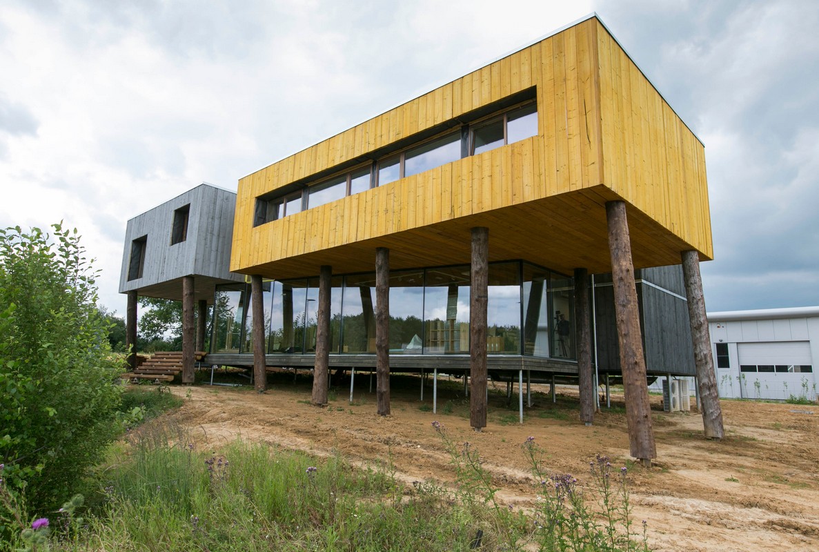 Le bâtiment UP STRAW qui loge les bureaux du Cluster Eco-Construction en Wallonie est composé de modules 3D de bois et de paille. Il est bâti sur des pieux pour préserver l’intégrité du sol. Photo : Denis Vasilov.