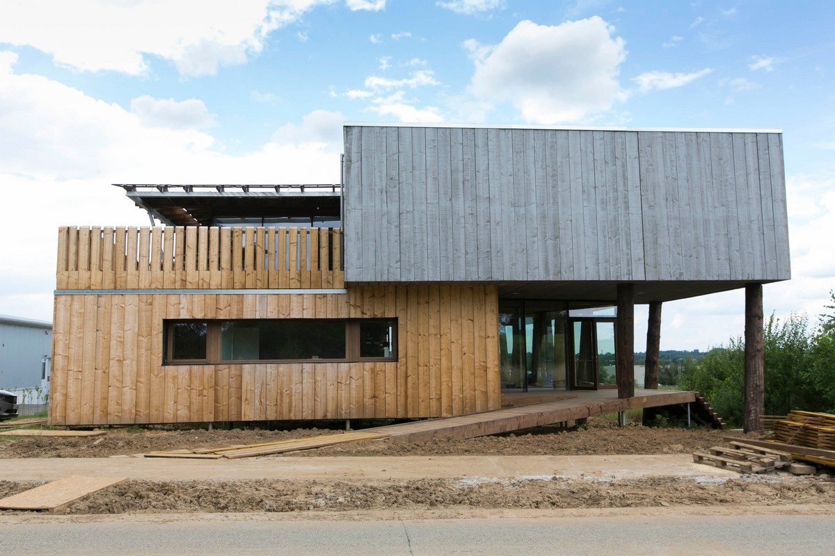 Le bâtiment UP STRAW qui loge les bureaux du Cluster Eco-Construction en Wallonie est composé de modules 3D de bois et de paille. Il est bâti sur des pieux pour préserver l’intégrité du sol. – Photo: Denis Vasilov – Architecte : Caroline Broux, architecte associée fondatrice d’Helium3.