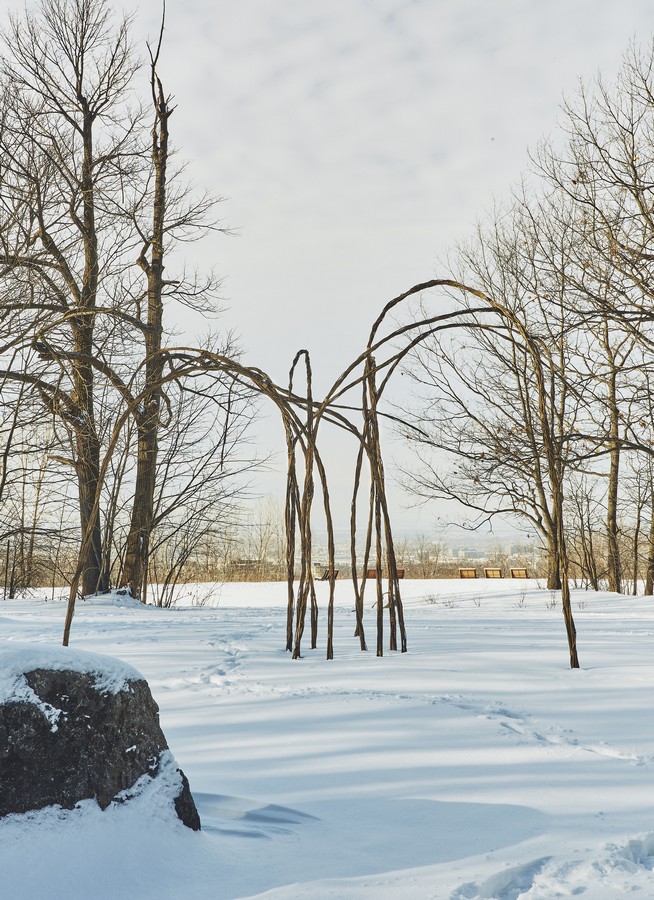 Dans la clairière située sur le sommet Outremont du mont Royal se dresse discrètement la silhouette d’un saule pleureur à l’allure courbée formé de tiges et de branches en bronze, une œuvre collective de la Société des archives affectives (Véronique La Perrière M. et Fiona Annis), en collaboration avec Nadia Myre et Malaka Ackaoui.
