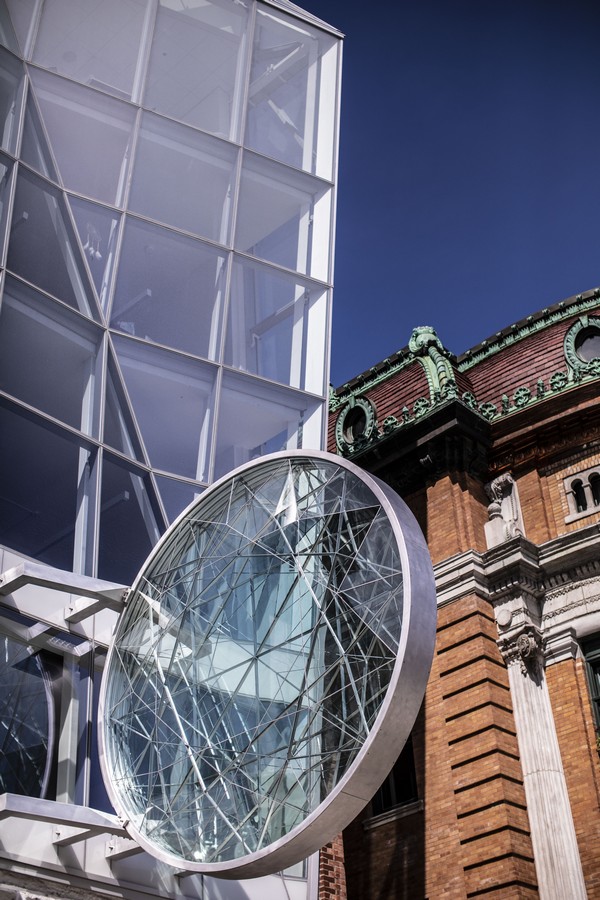 Placée perpendiculairement à la façade du nouveau complexe culturel Le Diamant à Québec se dresse une étonnante structure ronde et transparente. Création de Claudie Gagnon en collaboration avec Ludovic Boney, l’œuvre composée de cinq immenses cercles de verre trempé de 4,5 m de diamètre emprunte des motifs à la forme traditionnelle d’un diamant, mais renferme aussi d’autres éléments connexes – dont une rose des vents, un flocon de neige, un iris et un capteur de rêves. Les parties extérieures sont bombées et les motifs intérieurs des couches de verre sont décalés pour multiplier les angles et les effets. Des anneaux d’aluminium viennent encercler les morceaux de verre, coupés en pointes et retenus par un scellant. Le tout assemblé donne l’impression d’une enseigne kaléidoscopique de nature abstraite en remplacement de l’ancienne enseigne du Cinéma de Paris, qui était également de forme circulaire.