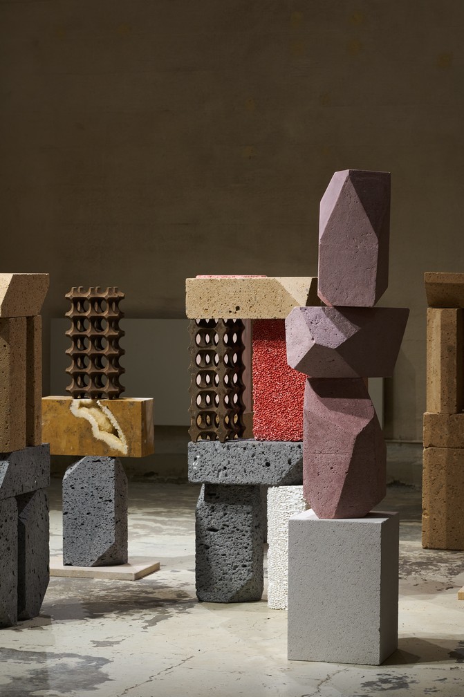 Sculptures du groupe Superflex exposées à la Maison du Danemark à Paris. Utilisant différents matériaux tels l’éponge végétale, le marbre, le béton léger, les sculptures à la verticale expriment la possibilité pour l’être humain et différentes espèces de plantes et d’animaux de vivre ensemble. – Photo : Robert Damisch – Agence Heymann Associés