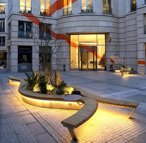 « Le design des dix îlots végétalisés, explique M. Tricoire, reprend la forme sinueuse du symbole de vie du serpent, créant un effet d’engrenages en mouvement. Les éléments sont disposés selon une ligne imaginaire entre les mobiliers qui dialoguent avec le geste artistique apposé sur l’architecture des lieux. Accueillir le public dans un cadre réhumanisé où la nature prend sa place et se développe harmonieusement dans des pièces de mobilier invitant au bien-être, à la détente et au travail nomade connecté. »