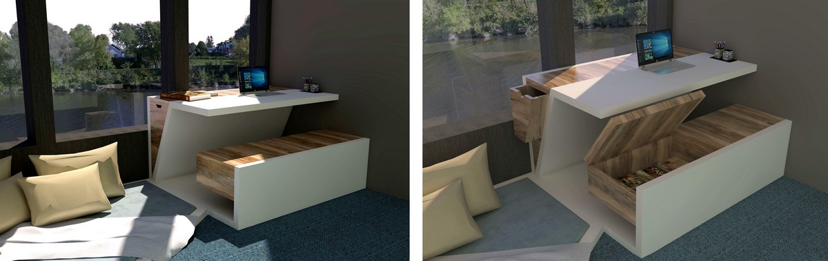 L’idée « Origami » lui est venue lors d’une discussion et elle l’a associée à la création d’un bureau, un meuble pratique qu’on utilise tous les jours, mais qu’elle n’avait jamais conçu. Pour fusionner le thème origami avec la création d’un bureau, elle a fait des recherches qui lui ont permis de se familiariser avec ce sujet et de développer son concept.