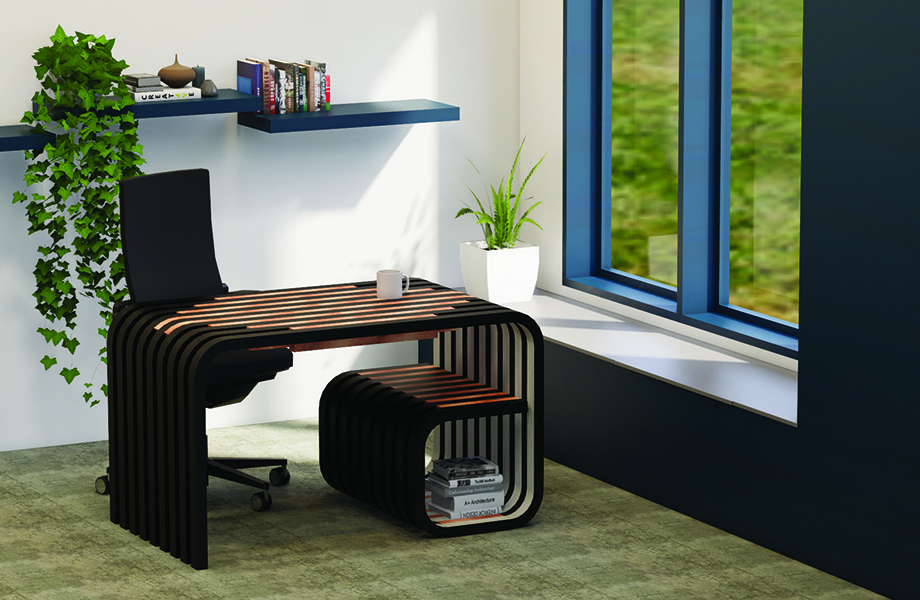 Le bureau Origami, conçu par Alexandra Clément, englobe l’art modulaire dans sa forme la plus simple, incarnant la créativité sans sacrifier la fonctionnalité. Inspiré de l’art ancestral du Japon, le bureau joue avec différentes formes et volumes pour maximiser son utilisation, y compris de multiples compartiments de rangement intégrés. Utilisant les stratifiés de marque Formica® Couche de sable, Placage de bouleau blanchi et Olivier huilé, ce design crée un contraste subtil à travers les différentes couches de motifs. Cette conception fait également un clin d’œil au papier : matière première utilisée à la fois en origami et dans le stratifié. Alexandra Clément a remporté un prix de 2000 $ US et verra son œuvre fabriquée et exposée lors de NeoCon 2021, du 14 au 16 juin 2021, au Mart de Chicago.