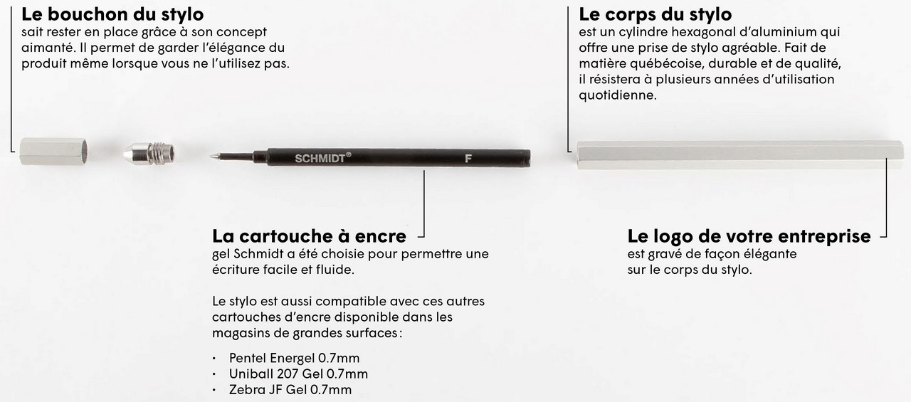 Conçu par les designers Étienne Vernier et Maxime Louis-Seize, l’objet présente des caractéristiques distinctives. Le corps du stylo, une forme cylindrique taillée en six facettes, facilite la prise en main. Le bouchon est retenu au stylo par un ingénieux système aimanté. De plus, le design a été pensé pour réduire au minimum le nombre de pièces afin de faciliter le recyclage de l’aluminium à la fin du cycle de vie (rappelons que ce matériau est recyclable à l’infini). Finalement, on peut aisément changer la cartouche d’encre.