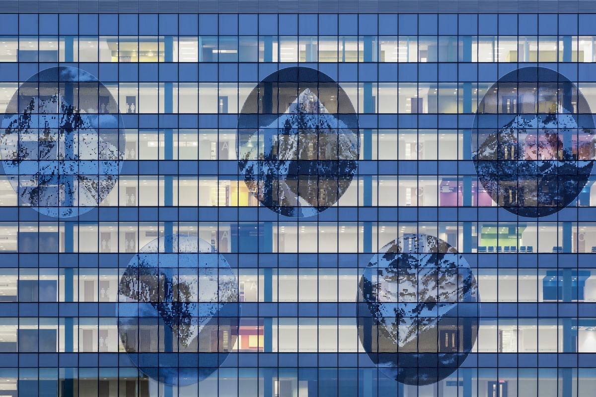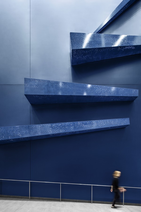 Cinq structures en béton coloré et perforé laissent percevoir la lumière de milliers de fibres optiques. L’œuvre titrée La traversée des lucioles a été produite par Louise Viger et fait écho avec l’architecture intérieure du complexe hospitalier. Photo : Adrien Williams