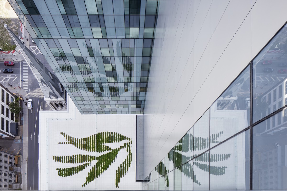 Cette création est l’intervention sur verre la plus importante dans l’histoire québécoise de la politique du 1 %. Imprimés selon la technique d’impression à encre vitrocéramique, 15 000 mots, dessins et pictogrammes forment 5 représentations en tondo de montagnes. Trois d’entre elles sont exécutées à l’endroit et 2 à l’envers. Visible de l’intérieur et de l’extérieur, la pièce de 2 610 mètres carrés couvre 8 étages de l’immeuble principal, rue Saint-Denis. Sur le plan symbolique, la montagne incarne pour les auteurs la durée, les défis à relever, mais aussi la spiritualité. Dans toutes les religions, notent-ils, la montagne est présente. Elle peut signifier autant la stabilité que l’immutabilité, l’ascension et la quête de soi. À remarquer également la représentation électrocardiographique du cœur vivant dans le dessin stylisé des montagnes. Cette analogie se veut un instantané de vie, le reflet électrique du parcours du cœur, organe vital de la biologie humaine.