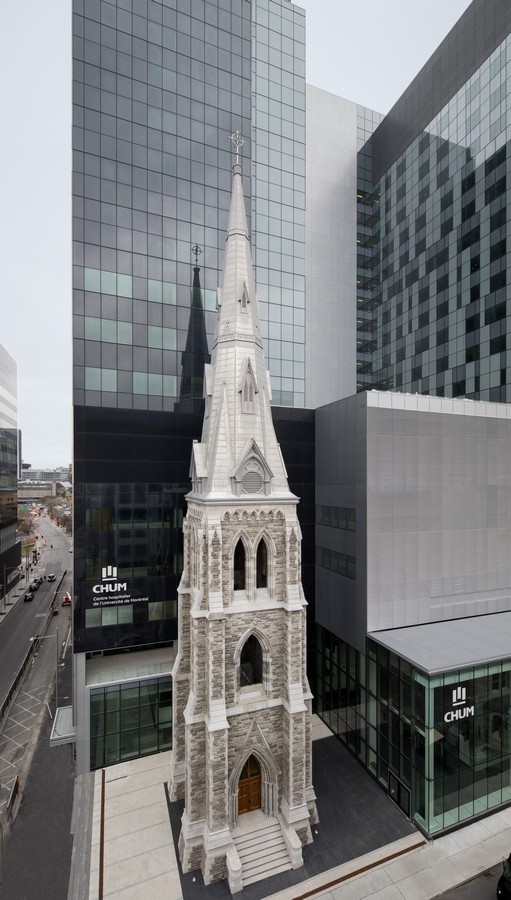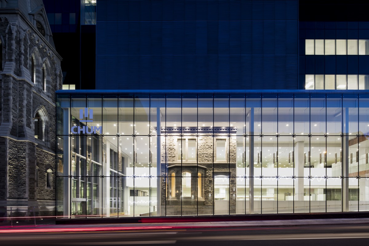 Contrairement au CUSM qui occupe le terrain d’une ancienne gare de triage, le CHUM est construit à l’intérieur d’un quadrilatère restreint du centre-ville de Montréal. Ce facteur fait en sorte que les enjeux reliés à l’intégration d’œuvres d’art au CHUM se posent différemment qu’au CUSM. Aux sculptures flamboyantes et signalétiques du vaste site Glen (Linda Covit, Michel Saulnier, Cooke-Sasseville) se déploient au CHUM des œuvres à caractère plus intimiste et, en général, de format plus réduit (Karilee Fuglem, Jean-Philippe Roy, Klaus Scherübel, Henri Venne). De même, l’exiguïté du terrain du CHUM et son emplacement en zone urbaine densifiée ont favorisé l’utilisation de la vitrine sur rue ou du mur-rideau comme support artistique. C’est le cas du duo Doyon-Rivest qui a conçu l’œuvre phare du nouvel hôpital : La vie en montagne.