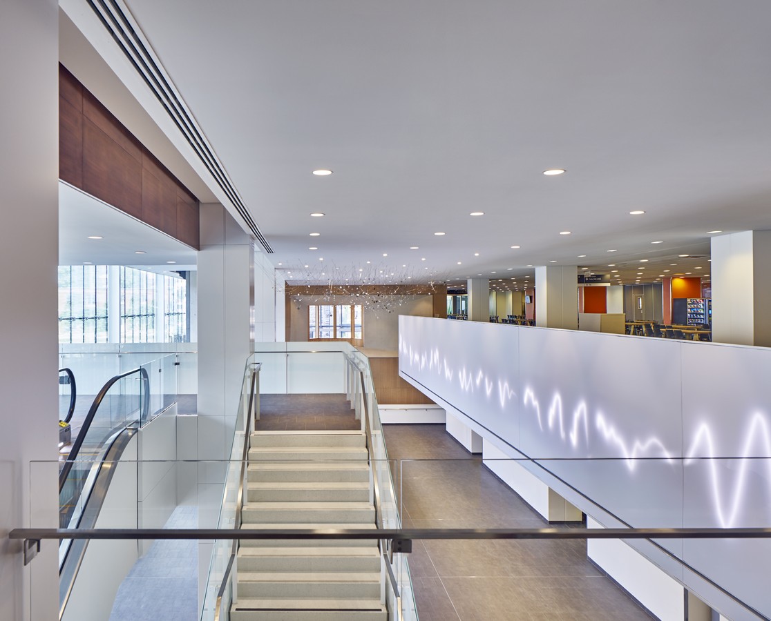 Imaginée par Nicolas Baier, l’œuvre Ligne de vie s’intègre à une balustrade traversant le rez-de-chaussée du CHUM sur 180 mètres. Grâce à des lumières DEL et un dispositif numérique, l’ouvrage simule en quatre minutes le parcours en mouvement d’un électrocardiogramme. Photo : Christopher Barrett
