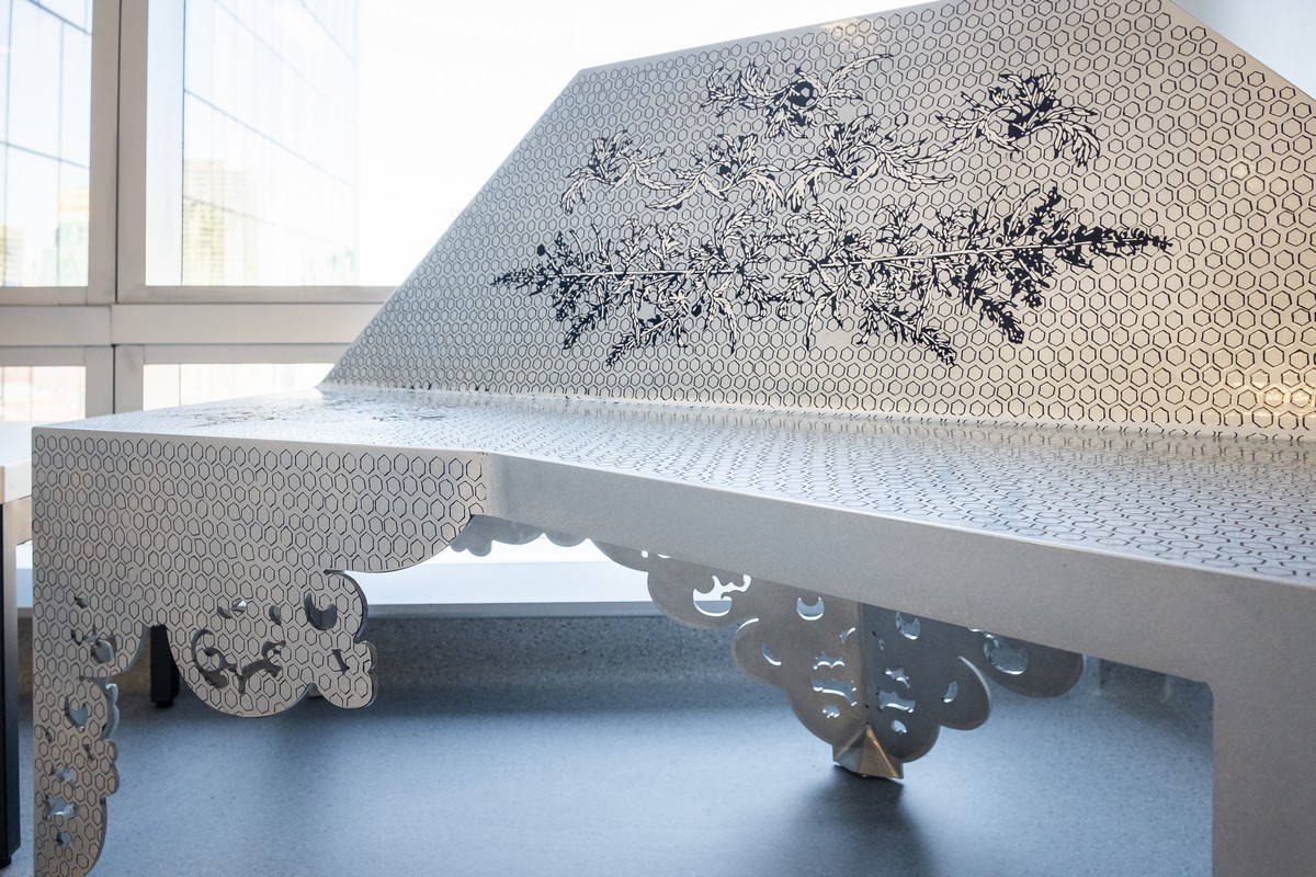 L’une des sept sculptures-bancs de Cynthia Dinan-Mitchell installée dans l’un des espaces dédiés aux visiteurs. Photos : Christian Brault