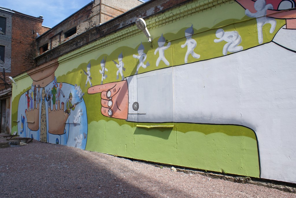 Alors que l’on traverse la cour intérieure, un son unique déchire le silence : le crissement du gravier sous nos pieds. Étrange endroit que cet immense désert de cailloux exposé au soleil brûlant, entouré de grillage métallique et où se dressent à chaque tournant des pans de murs en ruine, des lambeaux de plafond par où s’infiltre une lumière crue, des dédales sombres qui sentent l’humidité. D’anciens wagons en métal, entassés contre les clôtures et au centre, deux tables de ping-pong surmontées d’un écriteau qui se lit comme suit : Demandez les raquettes aux employés. On y marche en soulevant une poussière grise et sale qui prend à la gorge. C’est une vision d’après-guerre, de destruction. Et pourtant, cet endroit bien particulier n’est pas une zone de guerre dévastée, ni même un quartier désaffecté que ses habitants ruinés ont fui. Non, ce désert poussiéreux est un temple de l’expression humaine : le Musée de l’art de rue de Saint-Pétersbourg, en Russie.