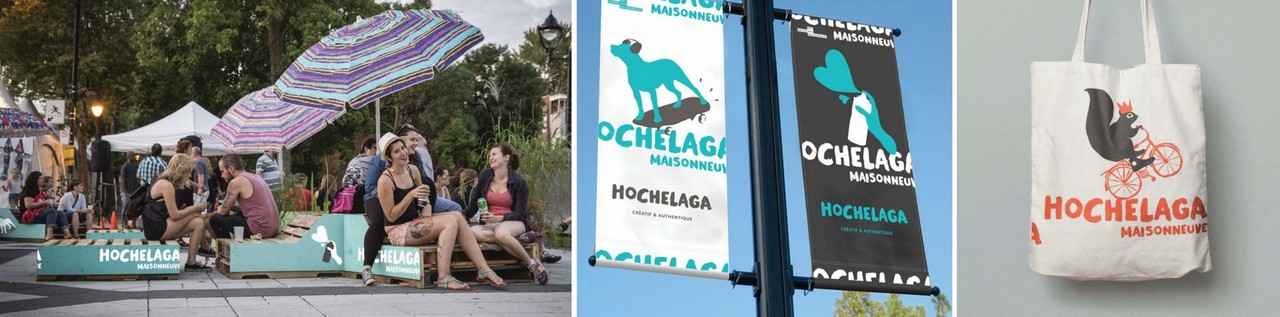 Diverses déclinaisons de la nouvelle image de la SDC Hochelaga : mobilier urbain, sac promotionnel, oriflamme – Source : Featuring