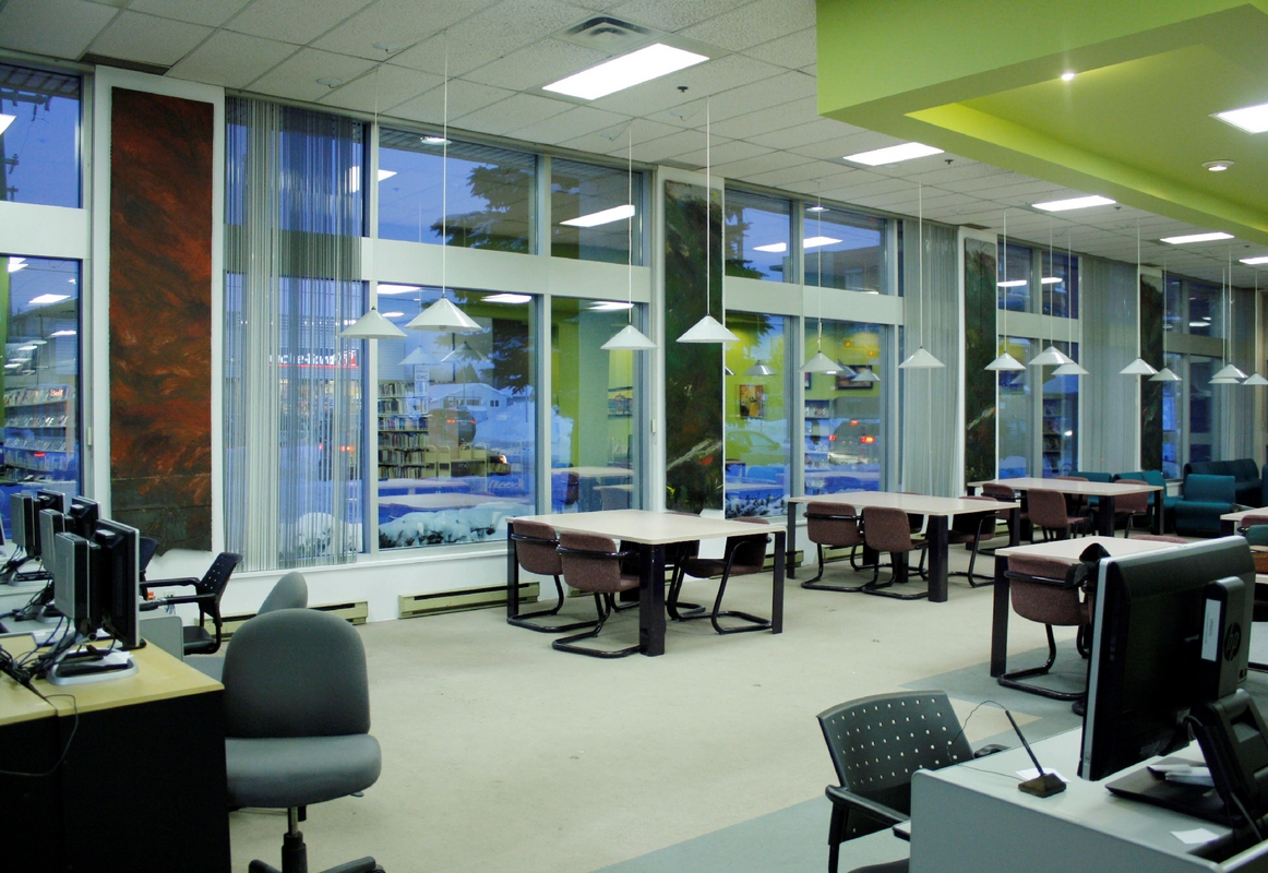 Louise Robert s’est aussi intéressée à l’art public. Le catalogue contient six références d’œuvres d’intégration de l’art à l’architecture. Celle réalisée en 1989 à la bibliothèque Laure-Conan à Laval regroupe une série de peintures sur acier installée sur les colonnades d’un espace vitré donnant sur l’environnement extérieur. L’œuvre épousela configuration verticale des colonnes tout en proposant un univers abstrait, empirique et poétique. S’écartant d’une représentation rationnelle du monde, l’artiste mise sur les multiples effets sensoriels que révèle la couleur sur la surface du tableau. Dans cet ouvrage d’art, Louise Robert nous convie à explorer un monde aux dimensions infinies par les effets de transparence. Ce désir d’évasion poétique par les mots et les images caractérise les œuvres intégrées à l’hôpital Jean-Talon.