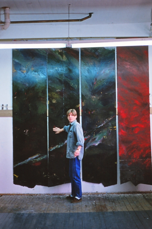 L’artiste devant les quatre plaques d’acier de l’œuvre Vedute avant son installation (1989).