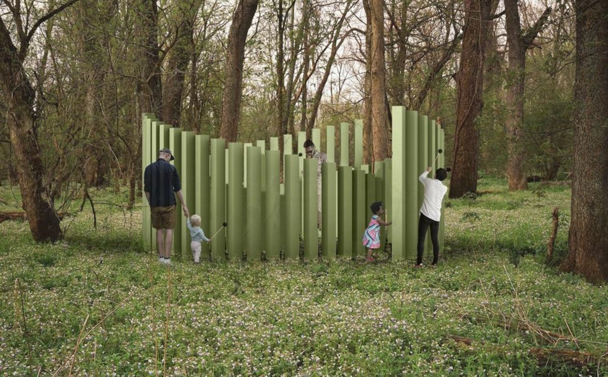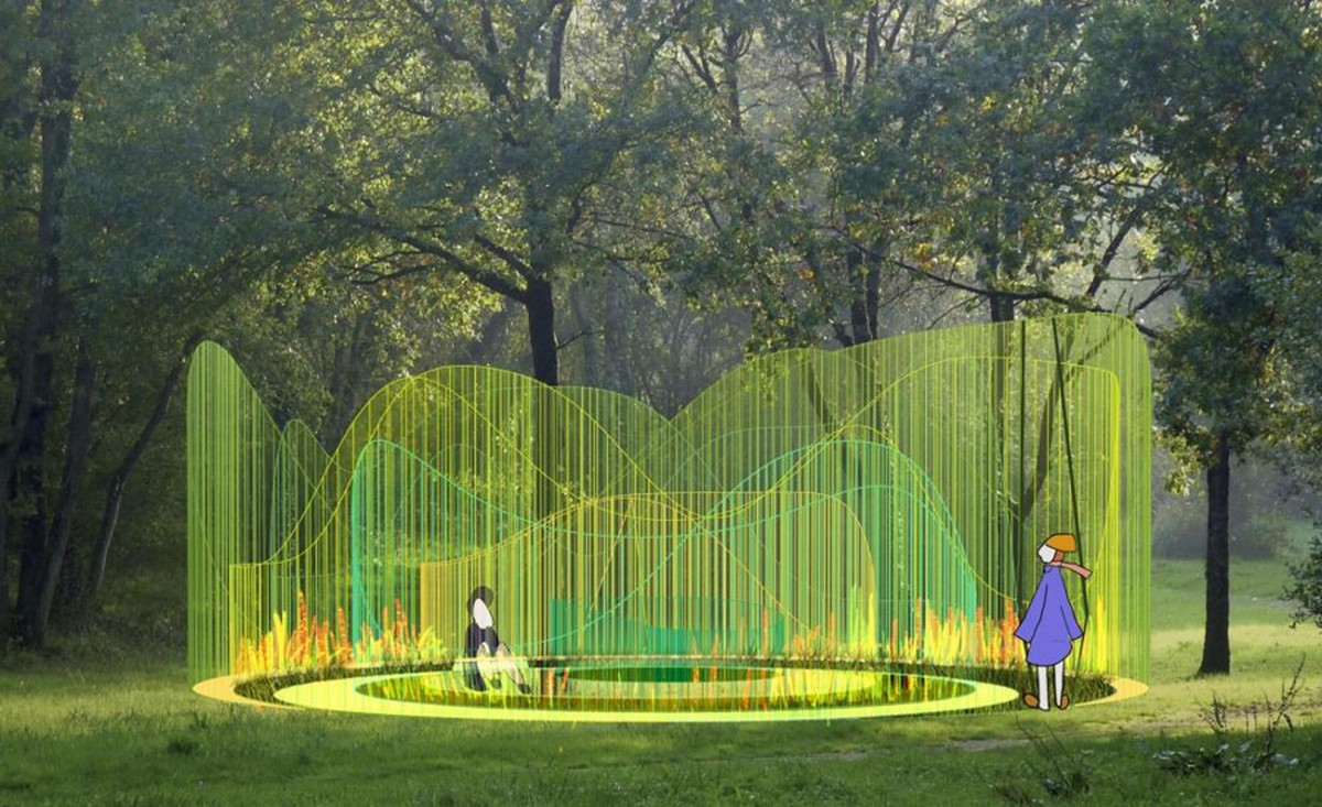 Corps de résonnance de Charlotte Barbeau, designer, Leila Desrosiers, designer, Félix Roy, designer de l’environnement et Jean-Benoit Trudelle, architecte – Montréal. Corps de résonance est une folie musicale qui prend forme dans une clairière de la forêt. Les visiteurs se déplacent dans et autour de cet instrument géant qui prend vie en vibrant aux sons de la forêt.