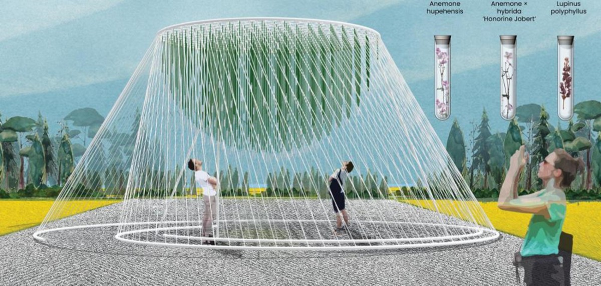 ENTWINE de Waiyee Chou, architecte paysagiste et Carlos Portillo, architecte paysagiste Toronto et Montréal. ENTWINE intègre l’ancienne technique de nouage du macramé pour mettre en valeur les variétés de plantes hybridées pour l’horticulture. À l’intérieur d’une spirale, les visiteurs sont libres de se promener entre les cordes de la structure et de s’y entrelacer.