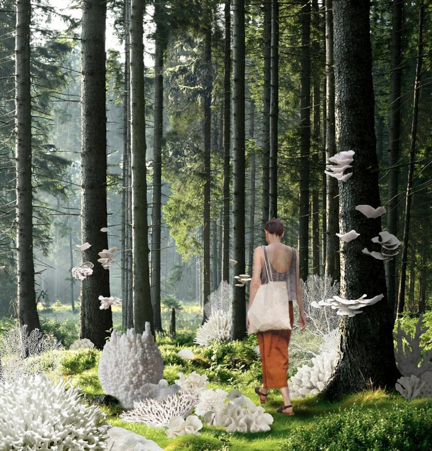 Forêt corallienne de Lucie Bulot, architecte et Dylan Collins, architecte – Montréal. Forêt corallienne est une barrière de corail d’un autre genre. Une communauté de calcaire s’enracine dans la forêt dans un métissage de couleurs et de formes qui crée un paysage insolite et une nouvelle communauté hybride.