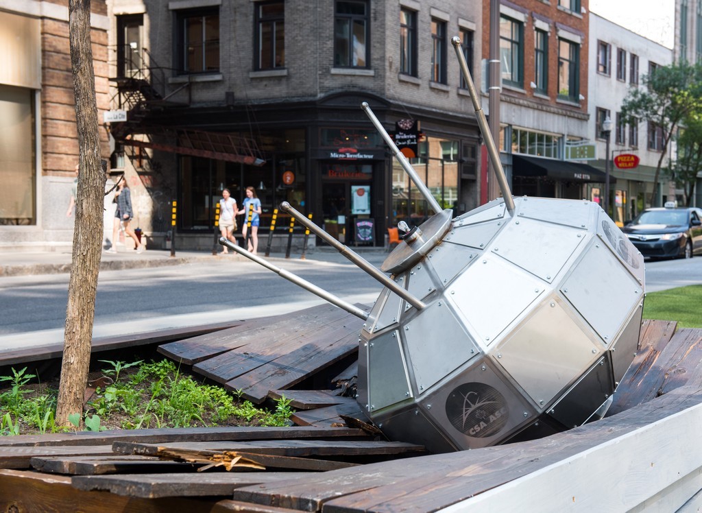 Le satellite Alouette s’est une fois de plus écrasé à Québec ! Cette réplique du satellite canadien présenté lors de l’édition 2018 de Passages Insolites, rappelle la promesse ratée d’un avenir meilleur annoncé par la modernité. Il pourrait autant représenter l’obsession toujours croissante pour les communications que l’accumulation de déchets spatiaux qui en résulte. Est-ce qu’un jour, le ciel nous tombera réellement sur la tête ?