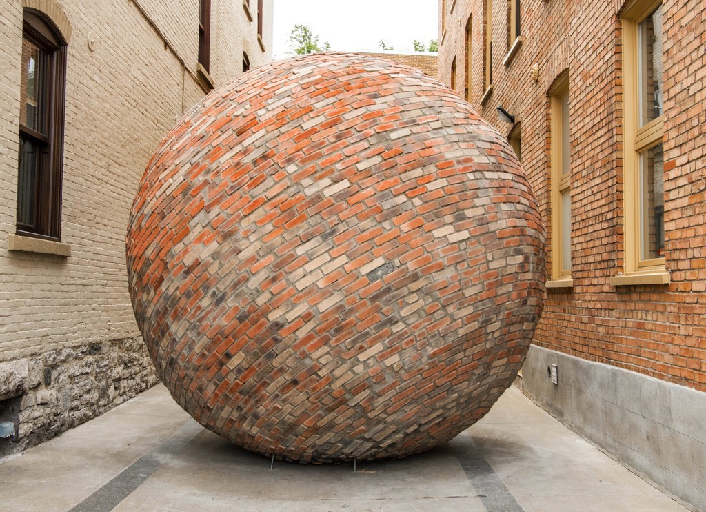 Cette sphère géante est-elle en train de dévaler la ruelle, ou de l’obstruer volontairement ? La forme sphérique se confronte à la verticalité des immeubles environnants tout en donnant l’illusion d’avoir été créée à partir du même matériau, la brique. Même si sa mosaïque rappelle ce matériau souvent utilisé dans l’architecture d’édifices commerciaux ou industriels du XIXe ou du début du XXe siècle, sa forme elle, contredit la rectitude des bâtiments, en apportant une touche plus actuelle. Osez donc vous approcher et faites-en le tour, le rapport à échelle humaine pourrait vous donner le vertige !
