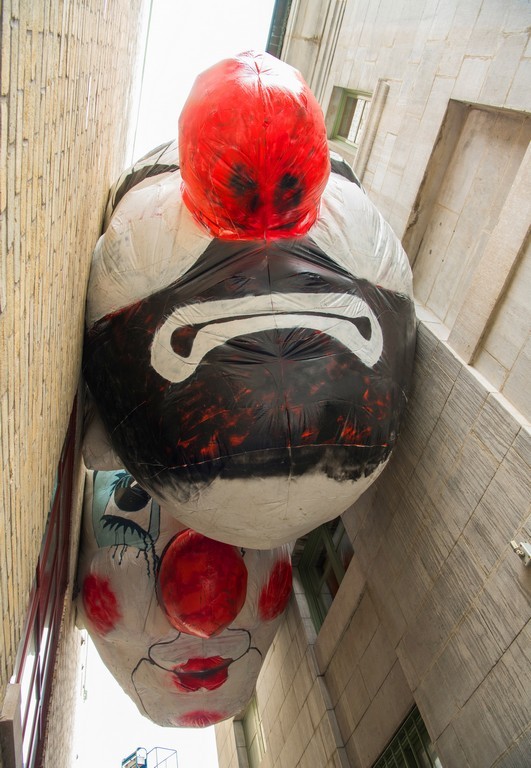 La scène paraît absurde : deux têtes de clown gonflables sont coincées entre des parois d’immeubles. Pour ajouter à l’étrangeté, ces clowns censés nous faire rire peuvent devenir inquiétants, selon notre point de vue et notre sensibilité. Le titre Fin de partie (Nagg & Nell) fait référence à pièce de Samuel Beckett où deux personnages, Nagg et Nell, vivent dans une benne à ordure après avoir perdu leurs deux jambes…