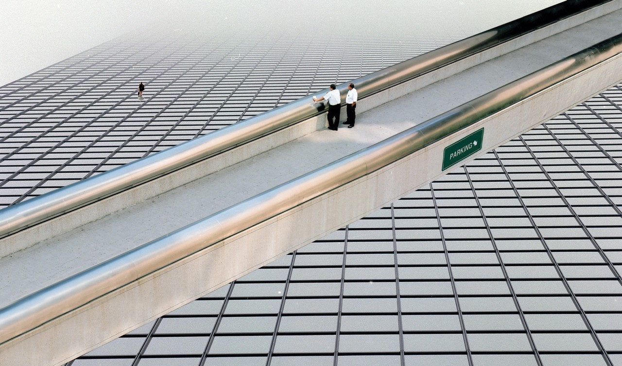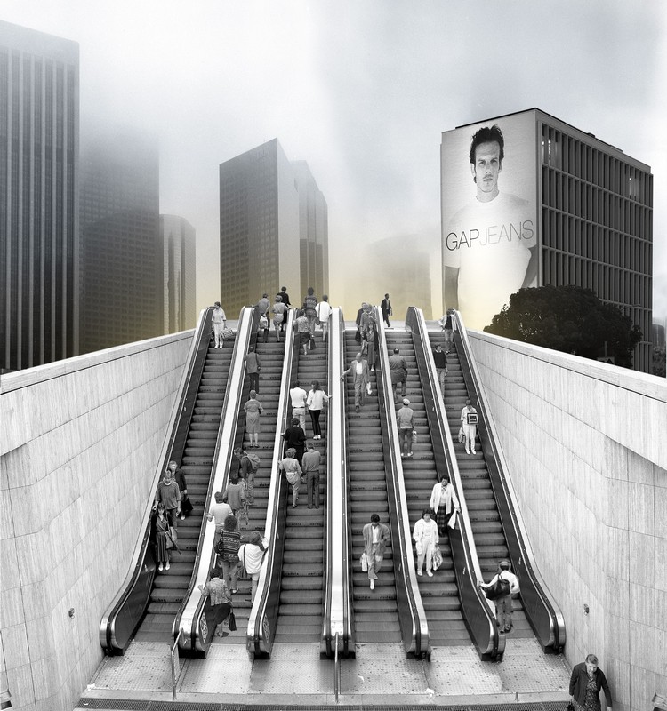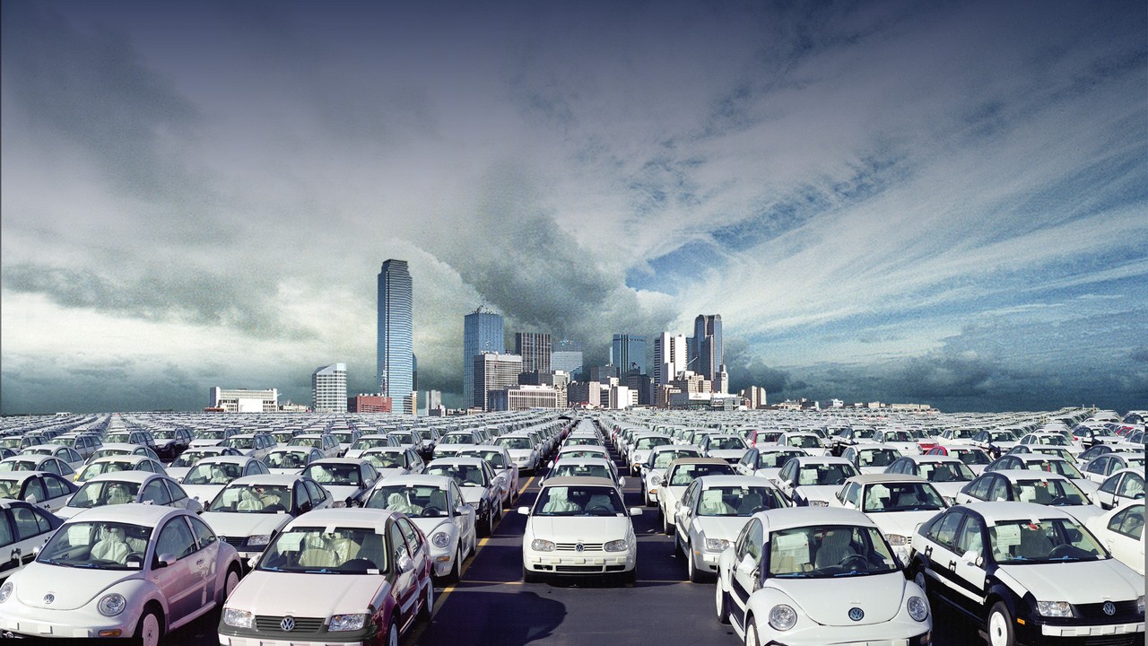 Une vision de la ville où le nombre d’autos et les surfaces consenties à leur stationnement deviennent astronomiques. Guimond s’attaque très tôt dans ses productions aux impacts de l’auto dans le monde contemporain. Dans cette œuvre, l’auteur présente l’automobile comme un fléau urbain tentaculaire entourant une ville moderne assiégée. – Pierre Guimond, photomontage 2005 – Source : Les états inventés d’Amérique