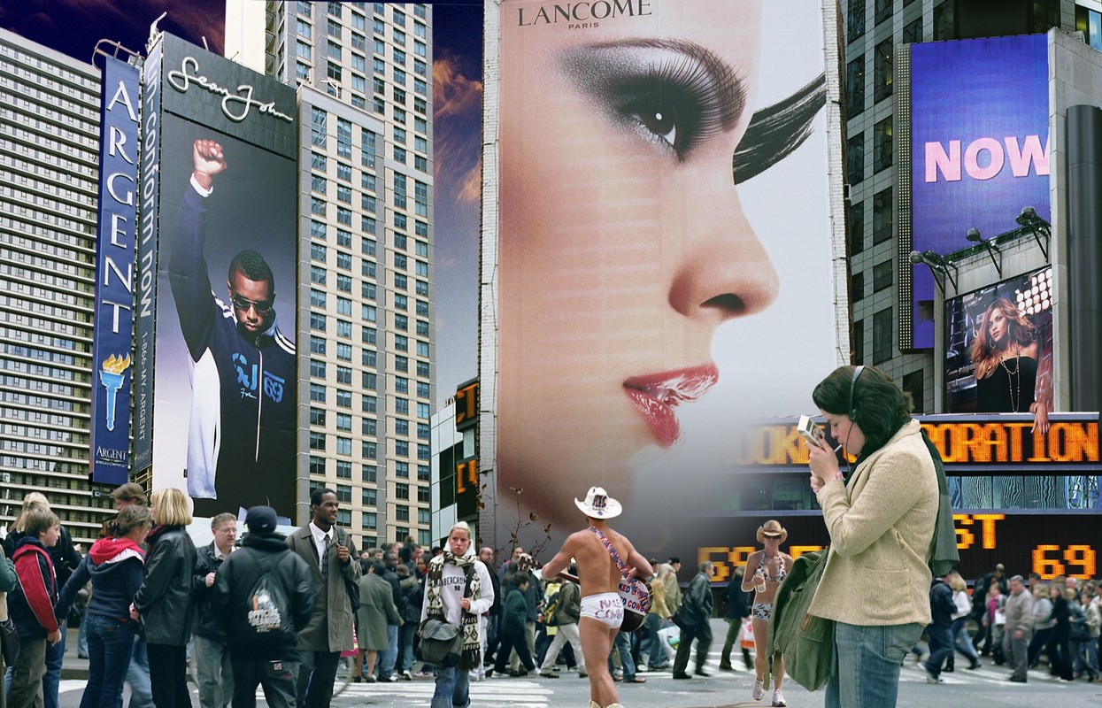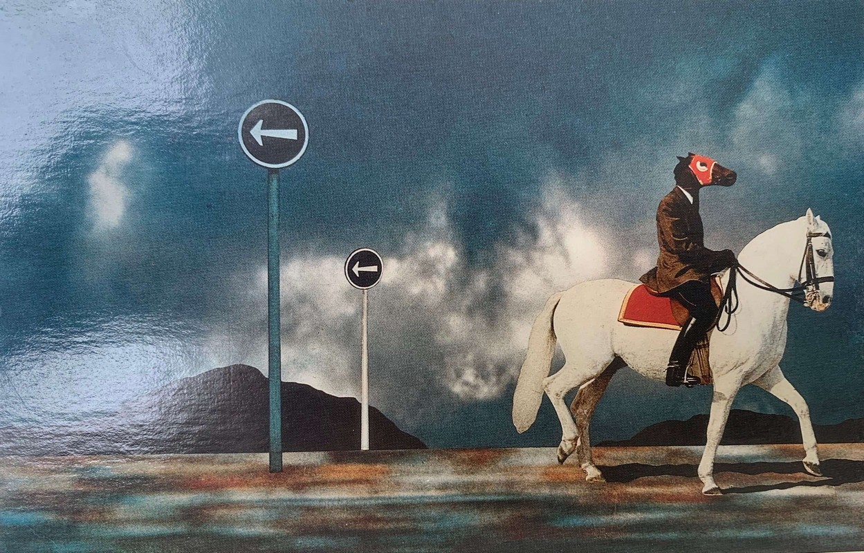 Cette image montre en quoi le photomonteur s’appuie sur la coexistence d’images contradictoires pour refléter la discordance propre à notre ère postmoderne. À gauche, la représentation d’un athlète afro-américain, poing levé comme à l’effigie de Munich, jouxte l’image d’une jeune fille envoûtante au conformisme érotique ambiant. Dans l’opuscule de l’exposition de 1986 à la Maison de la culture Côte-des-Neiges, l’auteur et cinéaste Jacques Godbout stipule qu’il existe deux sources d’images utilisées par Pierre Guimond : celle bouleversante de l’actualité planétaire, et la deuxième, séduisante, qu’il nomme « publiactualité ». Il conclut que les œuvres de Guimond agissent comme le contrepoids du discours marchand et témoignent de la dépersonnalisation de notre civilisation. – Pierre Guimond, photomontage 2003 – Source : Les états inventés d’Amérique