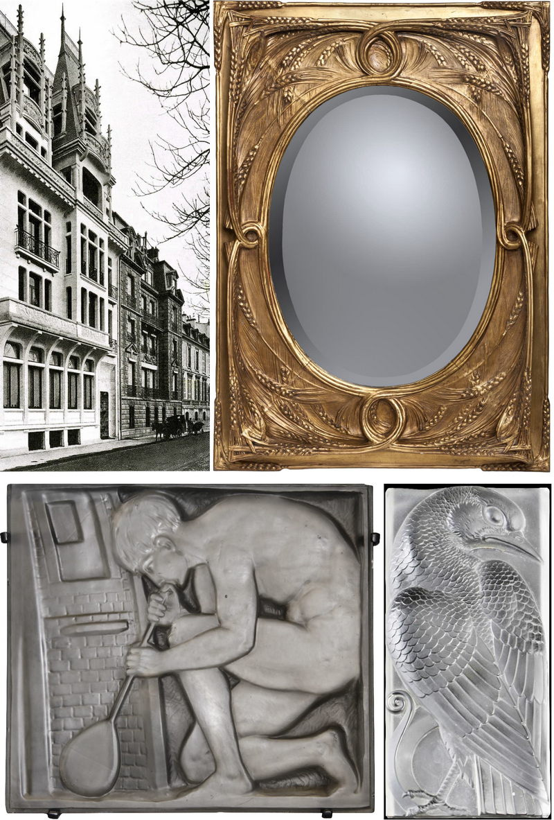 En plus de faire partie intégrante de la mise en valeur de l’Exposition des Arts Décoratifs et Industriels Modernes, René Lalique va s’intéresser au décor d’architecture intérieure d’hôtels particuliers pour des célébrités. Dès 1902, il se fait construire pour lui-même un hôtel particulier éclectique situé Cours Albert Premier dans le quartier des grands joailliers et parfumeurs. Il dessine des bas-reliefs, des miroirs, différents panneaux qui vont être intégrés à l’architecture intérieure des bâtiments – Source : Collection Musée Lalique.