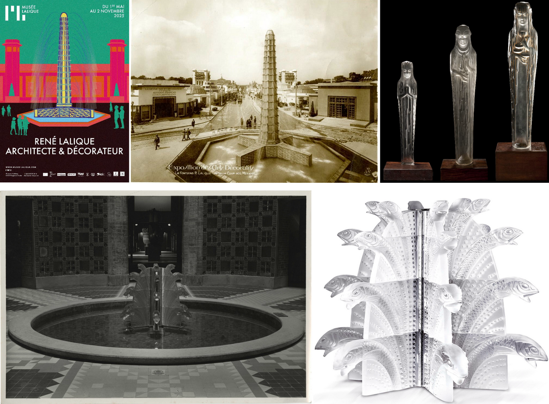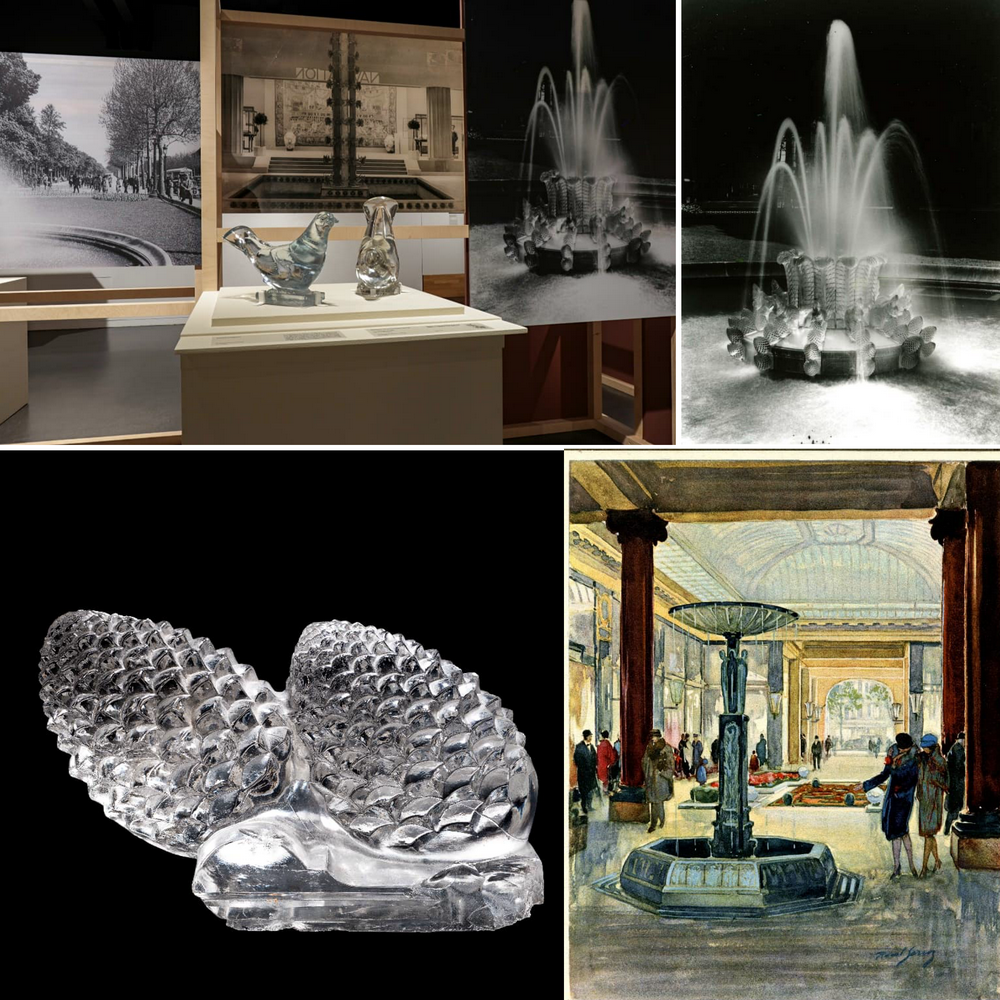 En 1925, la manufacture Lalique fut invitée à produire et à présenter des œuvres à l’Exposition Internationales des Arts Décoratifs et Industriels Modernes tenue à Paris. Ce moment dans l’histoire de l’architecture et de l’art est aussi le passage à la modernité où l’on voit apparaître des lignes qui se géométrisent, des formes qui se simplifient et des motifs qui se stylisent. Ce sera l’occasion pour René Lalique de mettre à profit sa sensibilité artistique protéiforme et son interprétation du mouvement art déco. Il y présentera un mobilier urbain de verre unique ; fontaines et sculptures de verre embelliront l’Exposition universelle dans toute leur splendeur transparente.
