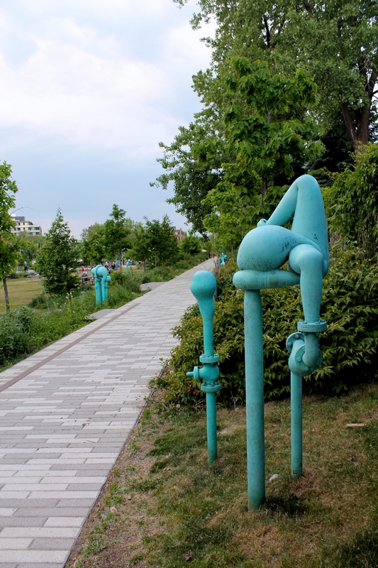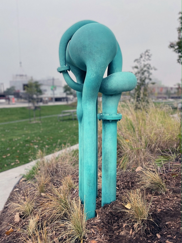 Environ 20 % de la surface a été convertie en espace vert. Pour concevoir sa série de sculptures Sporophores, l’artiste s’est appuyé à la fois sur le passé du lieu et sa transformation écoresponsable actuelle. Des figures iconoclastes, mi-humaines, mi-végétales, semblent surgir du sol par des tubes imaginaires, enfouis dans la terre, rappelant les infrastructures existantes (égouts, canalisations électriques, conduites d’eau).