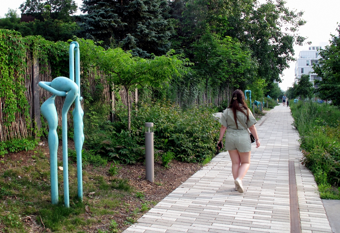 Dans ce nouveau parc de voisinage, la déambulation fait partie intégrante de l’expérience des usagers grâce au corridor piétonnier Camille-Laurin. Longeant principalement ce couloir fleuri, les sculptures de moyenne dimension font partie du projet de requalification de l’ex-zone ferroviaire.