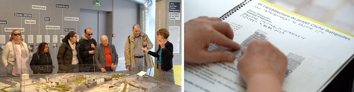 1 La collection de plans tactiles en braille et gros caractères présente les spécificités de l’écoquartier, la situation du quartier dans le Grand Paris, la disposition des rues de l’écoquartier ; les lignes de transport qui le traverse ; la mixité du quartier et ses fonctions urbaines, l’organisation du parc, l’architecture moderne du quartier en contraste avec l’architecture haussmannienne de ses abords.
