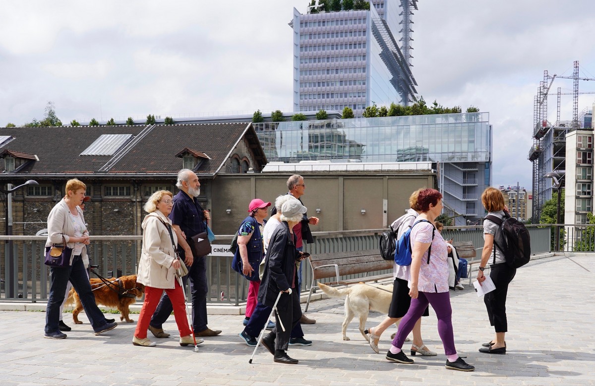 Manon Sarthou accueille des citoyens malvoyants et non voyants pour une découverte de cet écoquartier parisien et tente de leur transmettre la connaissance urbanistique et architecturale.