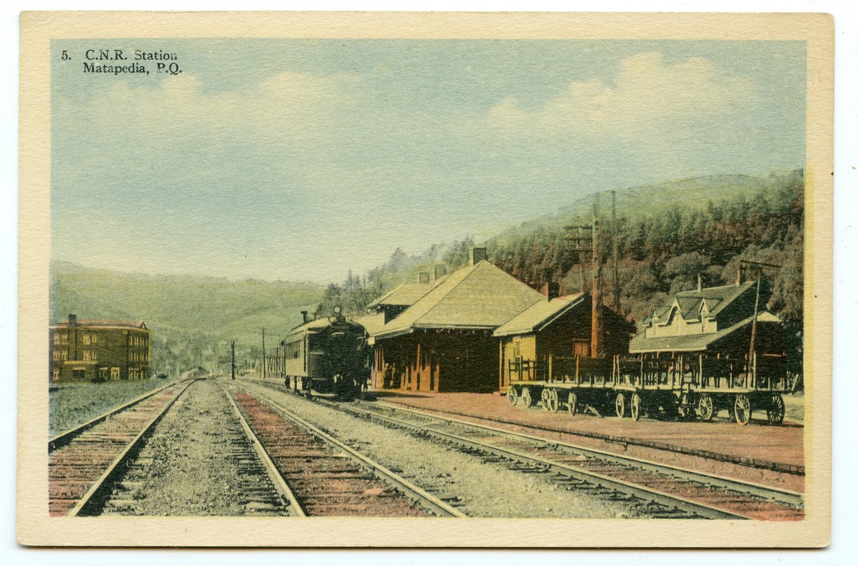 Carte postale de la gare de Matapédia. Datant de 1903, la gare est un carrefour important où les trains transitent vers Campbellton ou Gaspé, transportant passagers et marchandises. Cette gare patrimoniale toujours en service est également un pôle artistique et communautaire. – Source : Collection Michel Goudreau