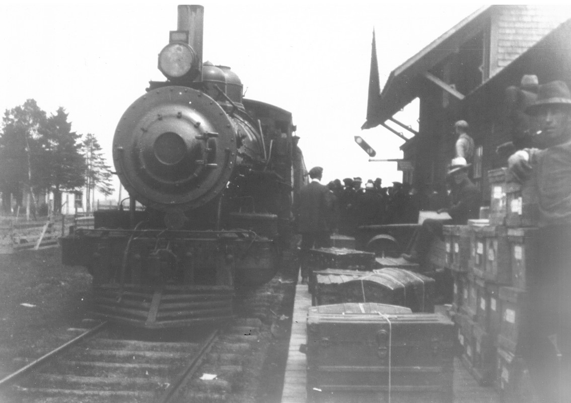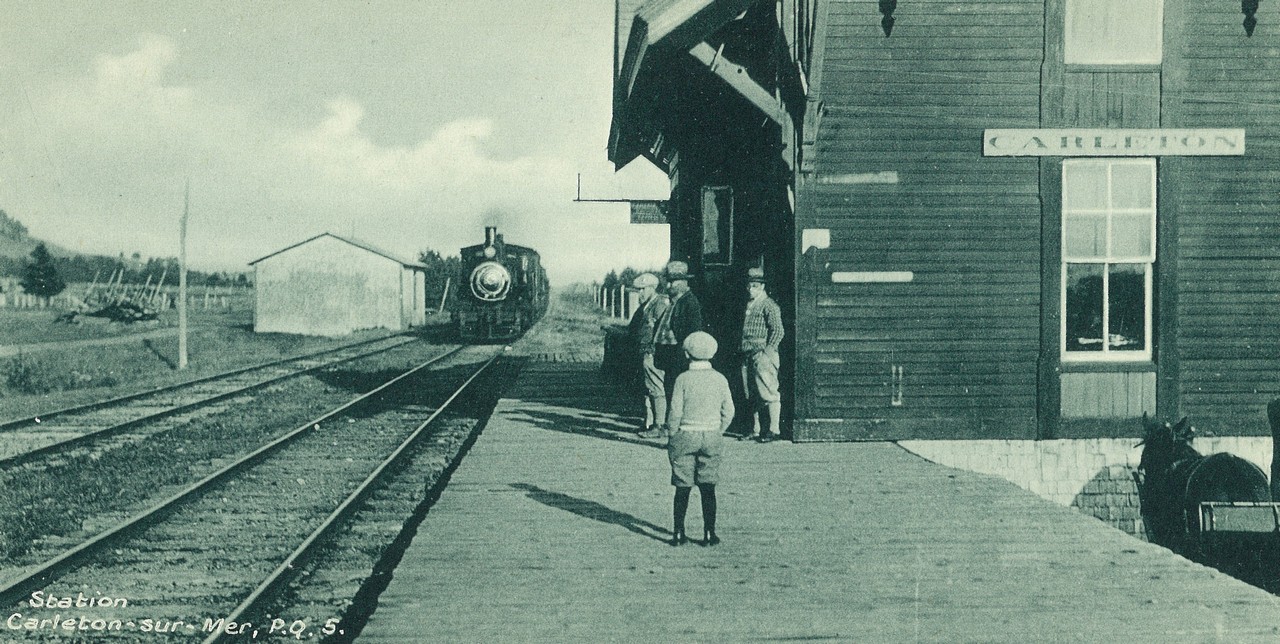 Gare de Carleton, années 1930. Le village de Carleton est desservi par le chemin de fer à compter de 1895. – Source : Musée de la Gaspésie, Collection de cartes postales, P169