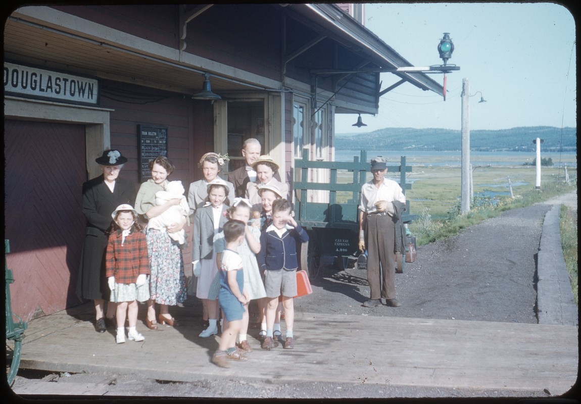 Gare de Douglastown qui se trouve très près de la plage, années 1950. À cette époque, le chef de gare et sa famille demeurent au second étage. La gare a été démolie. – Source : Musée de la Gaspésie, Fonds Famille Agnesi de Douglastown, P306/3/3/1