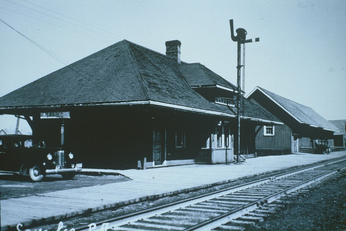 La gare de Sayabec sur la ligne ferroviaire de l’Intercolonial, années 1950. Construite en 1912, la gare a été restaurée et est désormais un lieu de culture ouvert au public depuis 2013. – Photo : Gaétane Audy – La Gare patrimoniale, Maison de la Culture de Sayabec