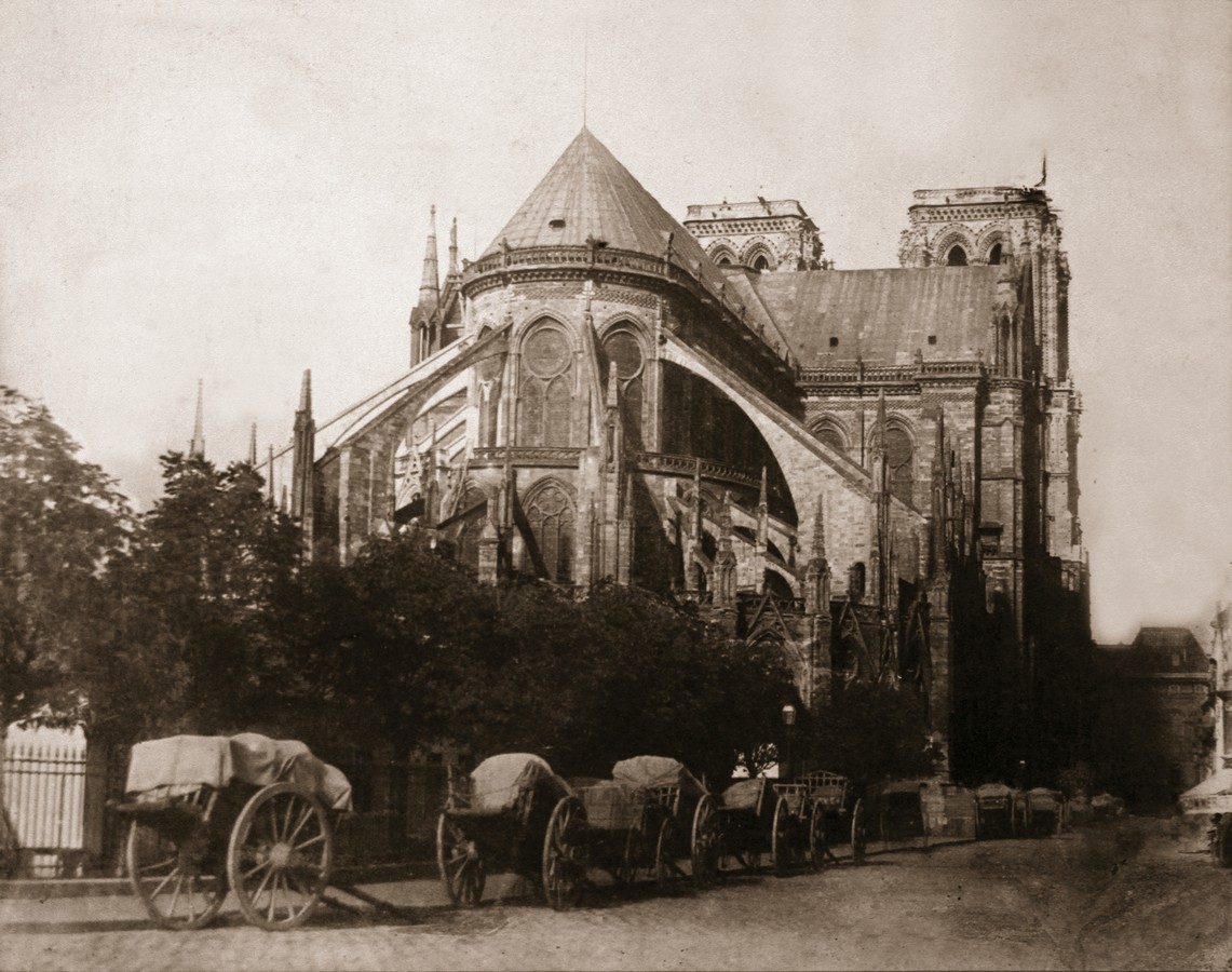 Charles Marville a contribué à répandre le charme de Notre-Dame. Il l’a d’abord photographiée telle qu’elle se présentait depuis 1786, avant l’ajout d’une flèche et de motifs par Viollet-le-Duc.