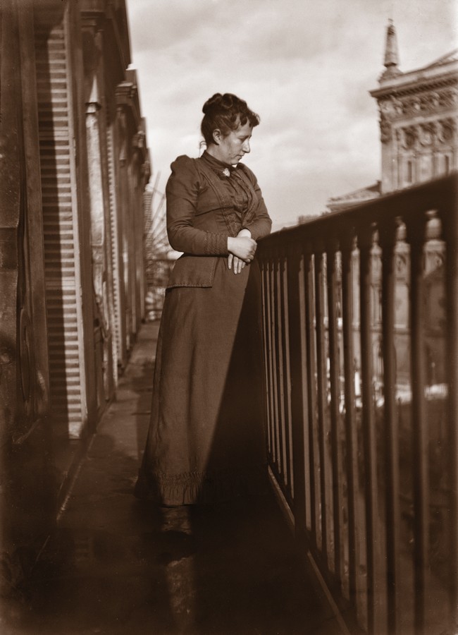 Photo de 1891 de Marie Minoret, avec qui Martial Caillebotte se marie en 1887. Il déménage alors rue Scribe près de l’Opéra, dont on aperçoit un des acrotères. L’immeuble semble d’architecture haussmannienne par la rythmique des volets des ouvertures et le balcon en fer forgé.Photo : Martial Caillebotte – Collection particulière © Comité Caillebotte, Paris