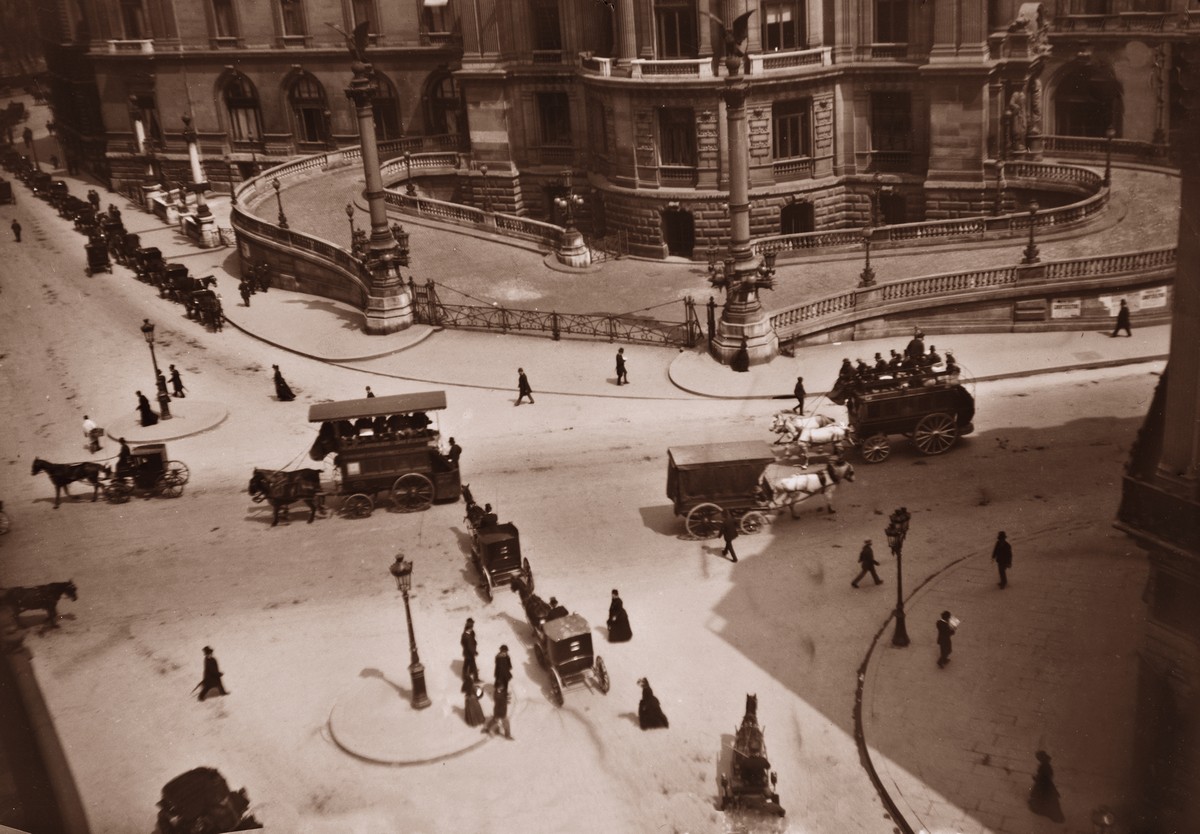 Opéra Garnier, rue Auber et rue Scribe entre 1892 et 1895. Il est probable que Martial Caillebotte ait pris la photo à partir du balcon de son appartement rue Scribe, mais nous n’en avons pas la certitude. Photo : Martial Caillebotte – Collection particulière © Comité Caillebotte, Paris
