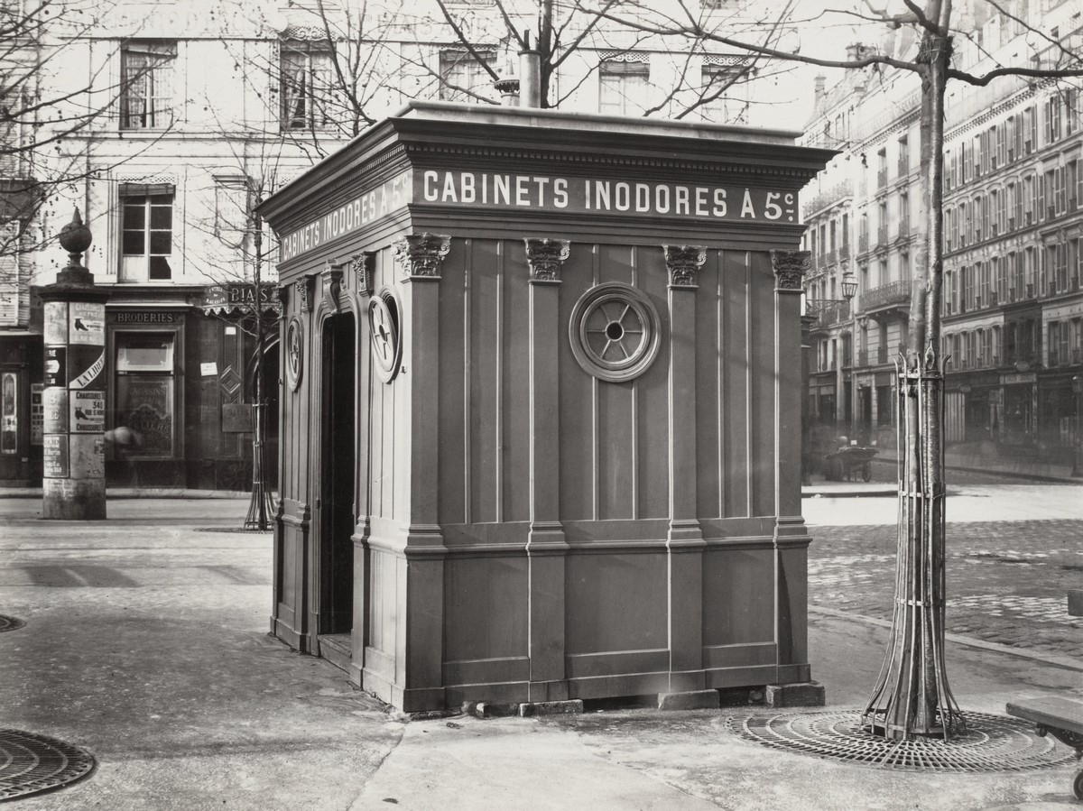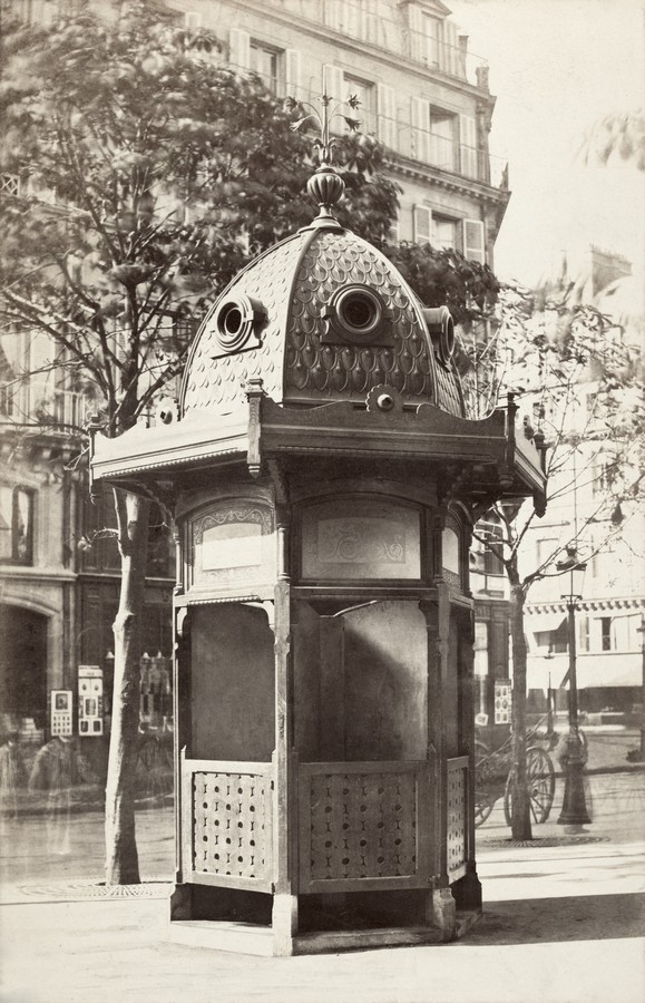 Parmi les diverses commandes de la Ville de Paris, Marville fut chargé de photographier le nouveau mobilier urbain – kiosques, cabinets d’aisance, bancs publics, etc. – et les nouveaux lampadaires, dont celui-ci, candélabre à lanterne ronde, square des Arts et Métiers, circa 1862 (aujourd’hui square Émile Chautemps), côté du boulevard de Sébastopol. Photos : Charles Marville