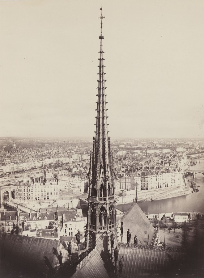 Très abîmée par le temps, la cathédrale a subi d’importantes modifications de 1844 à 1864. Marville a par la suite immortalisé ses nouveaux atours, dont la flèche très haute munie d’un coq à son sommet, des statues des apôtres, un personnage empruntant les traits de Viollet-le-Duc et des gargouilles parmi lesquelles on reconnaît Quasimodo (personnage du roman Notre-Dame de Paris, de Victor Hugo, paru en 1831).