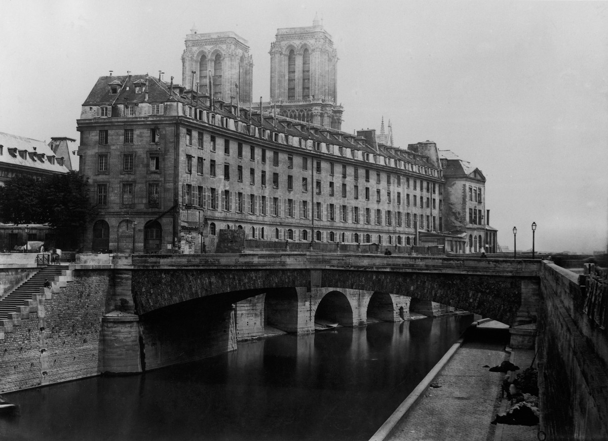 Sur cet autre cliché historique de Marville, la perspective vers Notre-Dame est obstruée par l'Hôtel-Dieu, le plus ancien hôpital de la capitale. Durant le Second Empire, à l'initiative du baron Haussmann, l'Hôtel-Dieu est déplacé dégageant ainsi la vue sur la cathédrale. En arrière plan, à droite, l'ancien hospice des Enfants-trouvés est également détruit lors de la restructuration de l'Île-de-la-Cité par Haussmann.