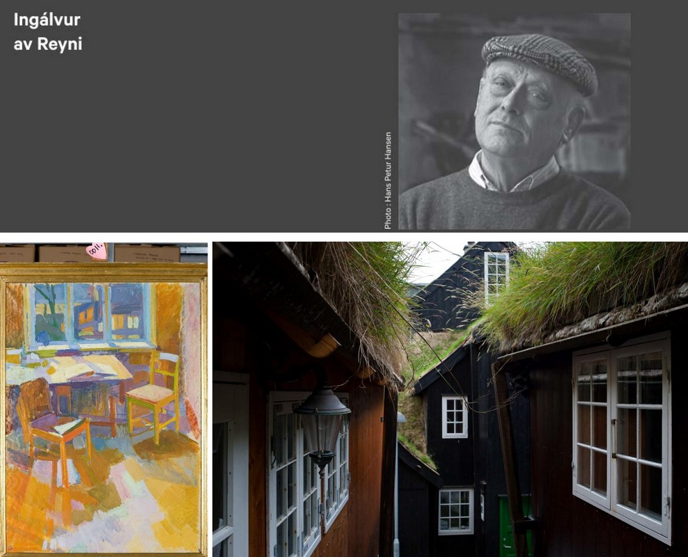 Ingálvur av Reyni, mort en 2005, demeure quant à lui le peintre interprète du territoire féroïen. Il aimait peindre les villages et les intérieurs des maisons des îles Féroé en leur donnant un aspect pictural cubique caractéristique du postimpressionnisme. Il rendait ainsi une atmosphère architecturale très colorée. Intérieur printemps (1947), huile sur toile, 90 x 65 cm, heymann-associes.com – Photo : Alessio Mesiano