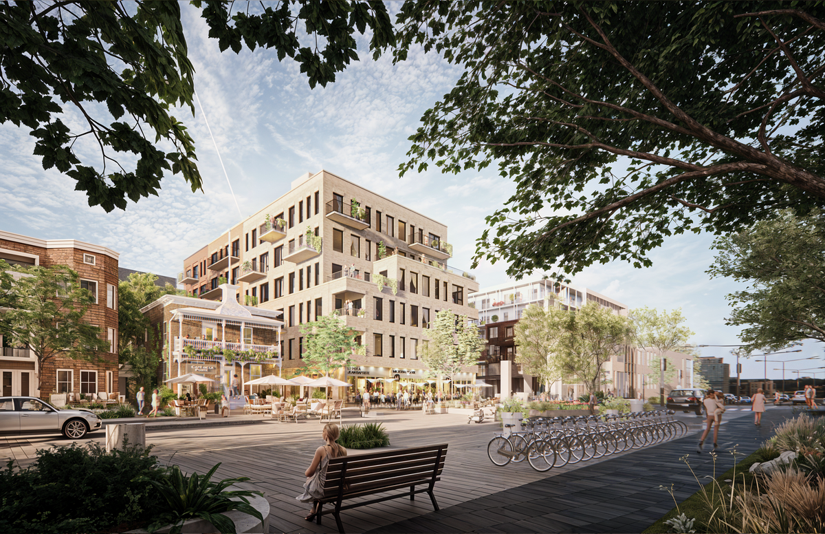 Le projet participe à l’animation de la Place du village, boul. Saint-Jean-Baptiste. Le volume du bâtiment B est découpé pour s’harmoniser avec le gabarit de la maison patrimoniale (bâtiment D) qui sera transformé en espace public. Vue du bâtiment A sis au nord de la rue Notre-Dame Est. – Source : ADHOC