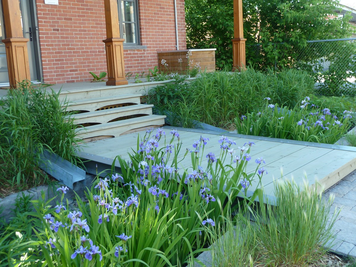 Jardins de pluie aménagés au projet Bonaventure à Montréal et sur un terrain résidentiel à Laval. Source : Groupe Rousseau Lefebvre.